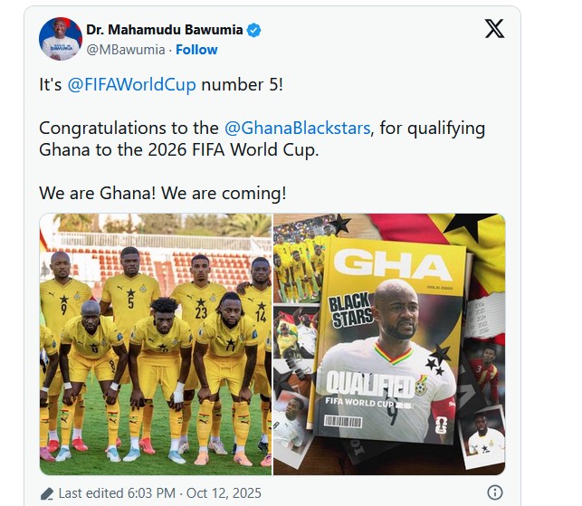 This is the fifth @FIFAWorldCup!up! Congratulations to the @GhanaBlackstars for qualifying Ghana for the 2026 FIFA World Cup. We are Ghana!
