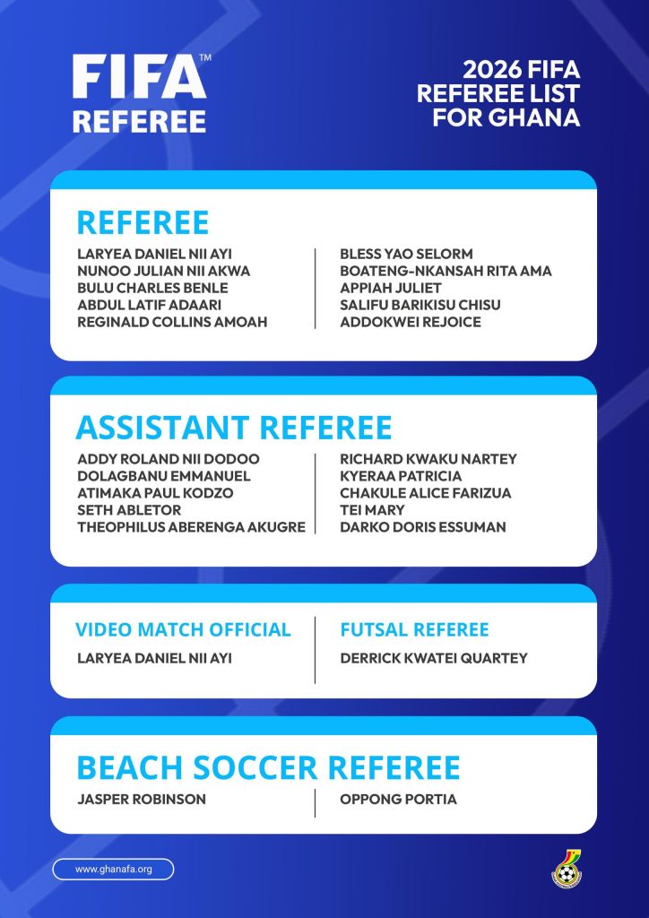 FIFA has revealed the list of Ghanaian referees who can officiate international matches in 2026, highlighting Ghana’s strong presence.