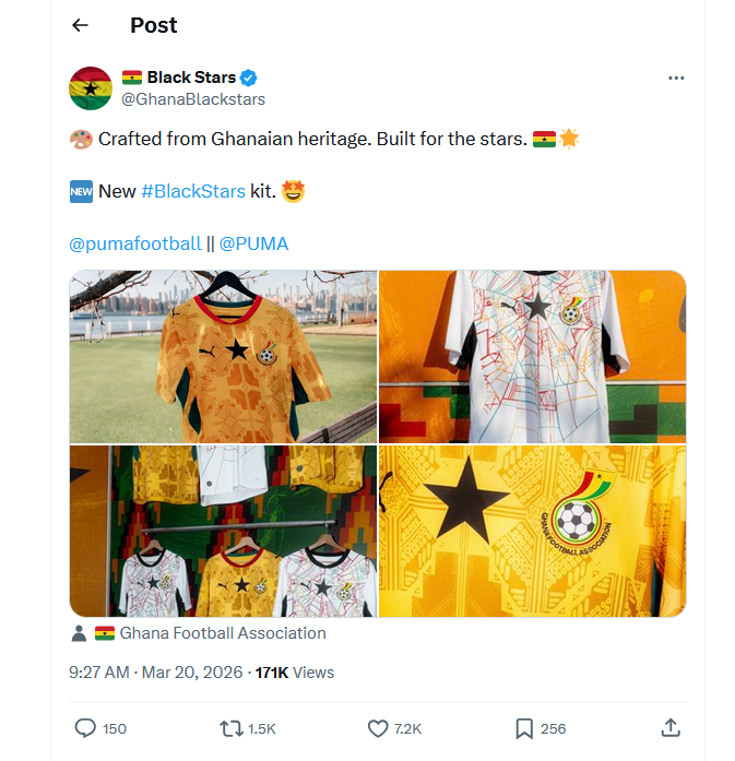 The jerseys will be available worldwide from March 24, 2026, at approximately GH₵1,600, ahead of Ghana’s opening match against Panama on June 17 in Toronto.