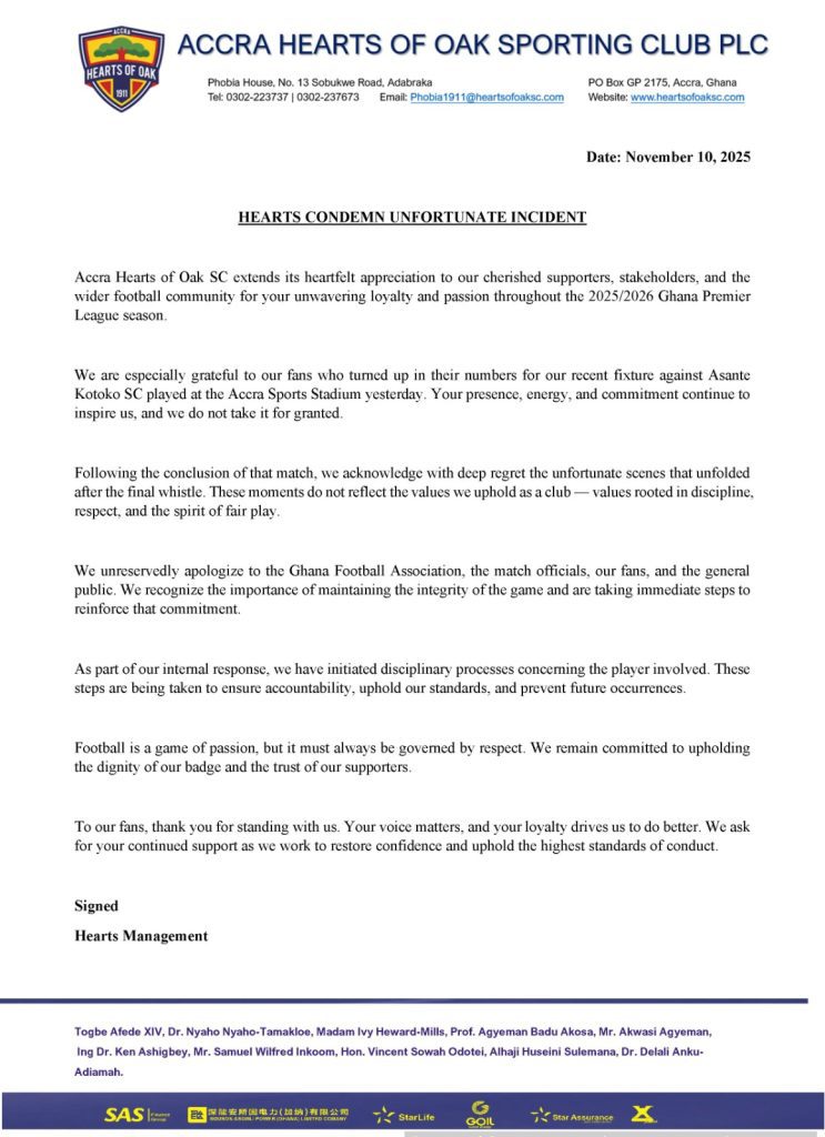 Hearts of Oak has issued a statement condemning the assault on officials following their Super Clash loss to Asante Kotoko on Sunday.